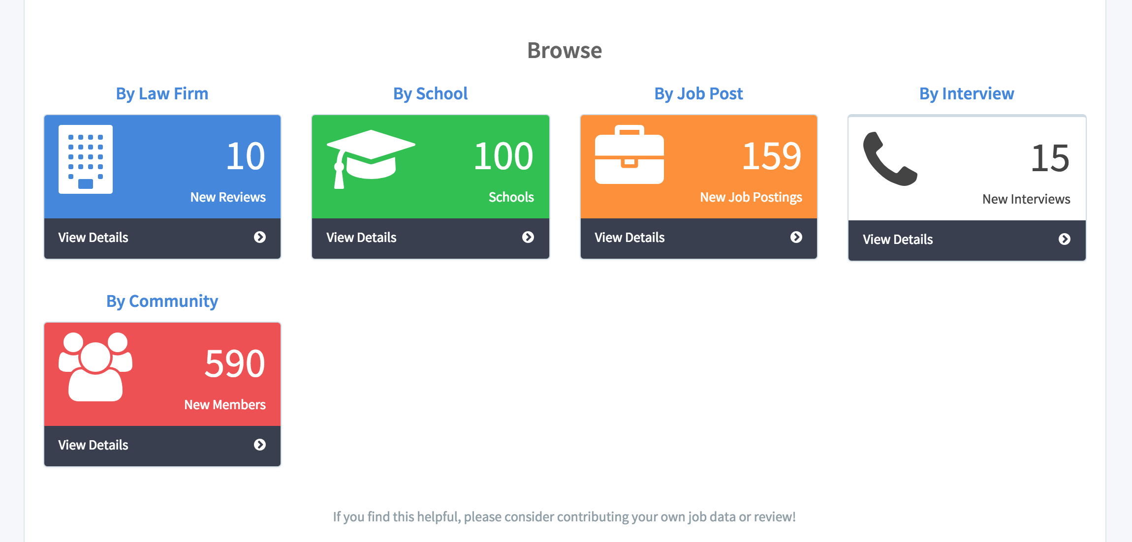 Despite having close to 600 users now, probably 3-400 of whom are going through OCI, there have only been 159 job postings.  I don’t know why law students are so secretive about this information.  I guarantee that extremely few people care one way or another.  So despite the thousands of views to the job postings and law firm reviews, law students are reluctant to contribute themselves.  I may eventually introduce some gating in the future to encourage more contribution, but won’t do that at first.  Cmon people, contribute!  I built this website for you.